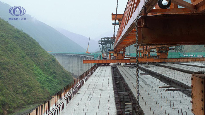 東川區(qū)屬于泥石流地質(zhì)災(zāi)害區(qū)域,高山深谷,地理位置險要,雨季洪澇、泥石流災(zāi)害頻發(fā)。2016年6月3日雨季來襲,大白河流域水位持續(xù)暴漲,徐家地隧道出口沖溝突發(fā)泥石流災(zāi)害,得益于我們提前制定的應(yīng)急預(yù)案和沿河防護措施到位,極大減少了災(zāi)害對下部結(jié)構(gòu)的損壞和影響,也未發(fā)生任何人員傷亡。但來勢洶洶的洪水阻斷了橋梁下部結(jié)構(gòu)施工長達整整3月之久,直至2016年10月15日才正式開始了T梁吊裝工作,為趕上工期要求,我們不得不使用代價相對較高的重型汽車吊來吊裝115片T梁,以完成36米跨度貝雷桁架組合固定式門吊的安裝工作,為后續(xù)工作的開展與推進爭取時間、創(chuàng)造優(yōu)勢。歷時15個月的艱苦奮戰(zhàn),我們凝心聚力、攻堅克難,最終順利的完成了右幅梁板的安裝。